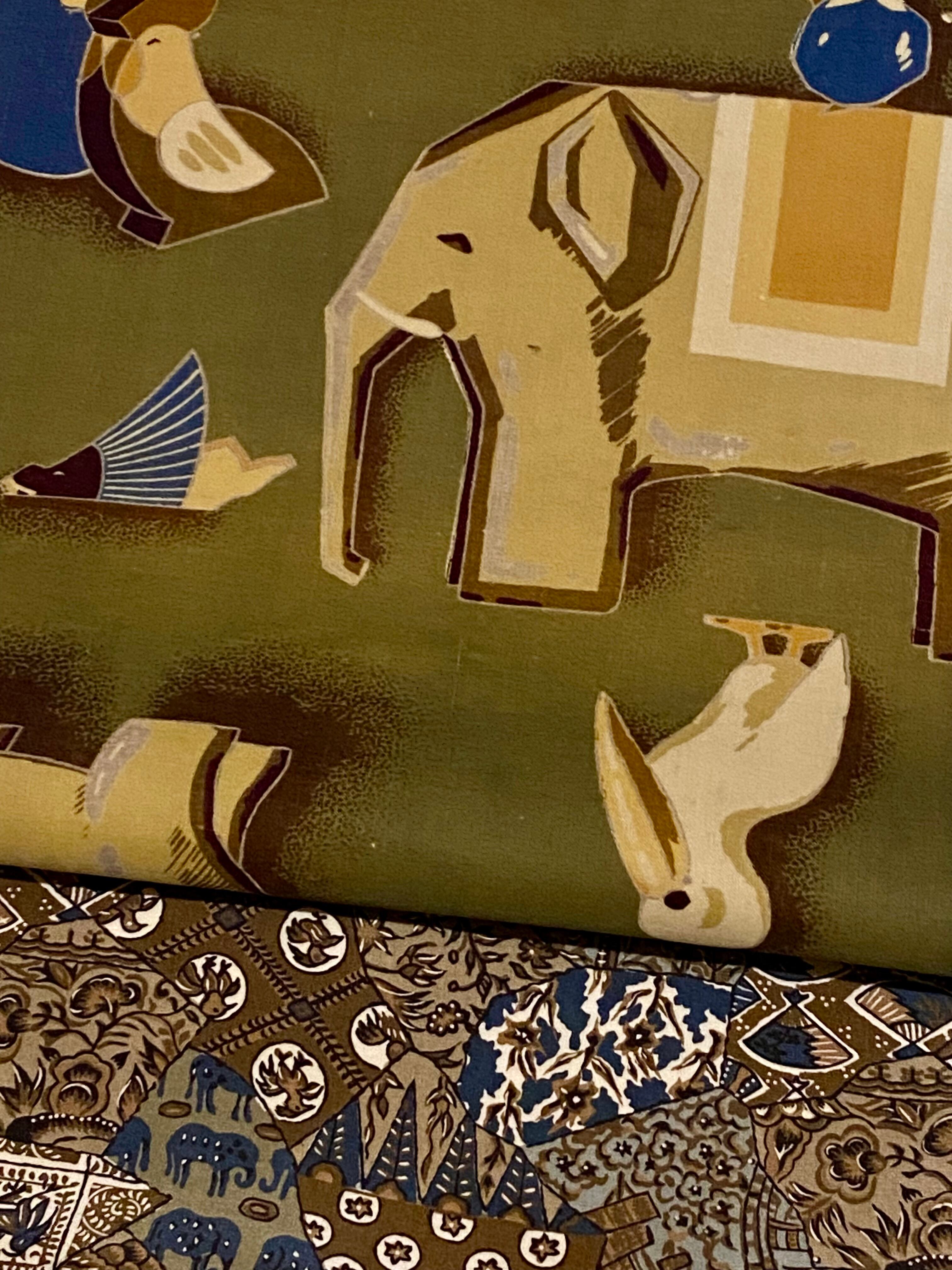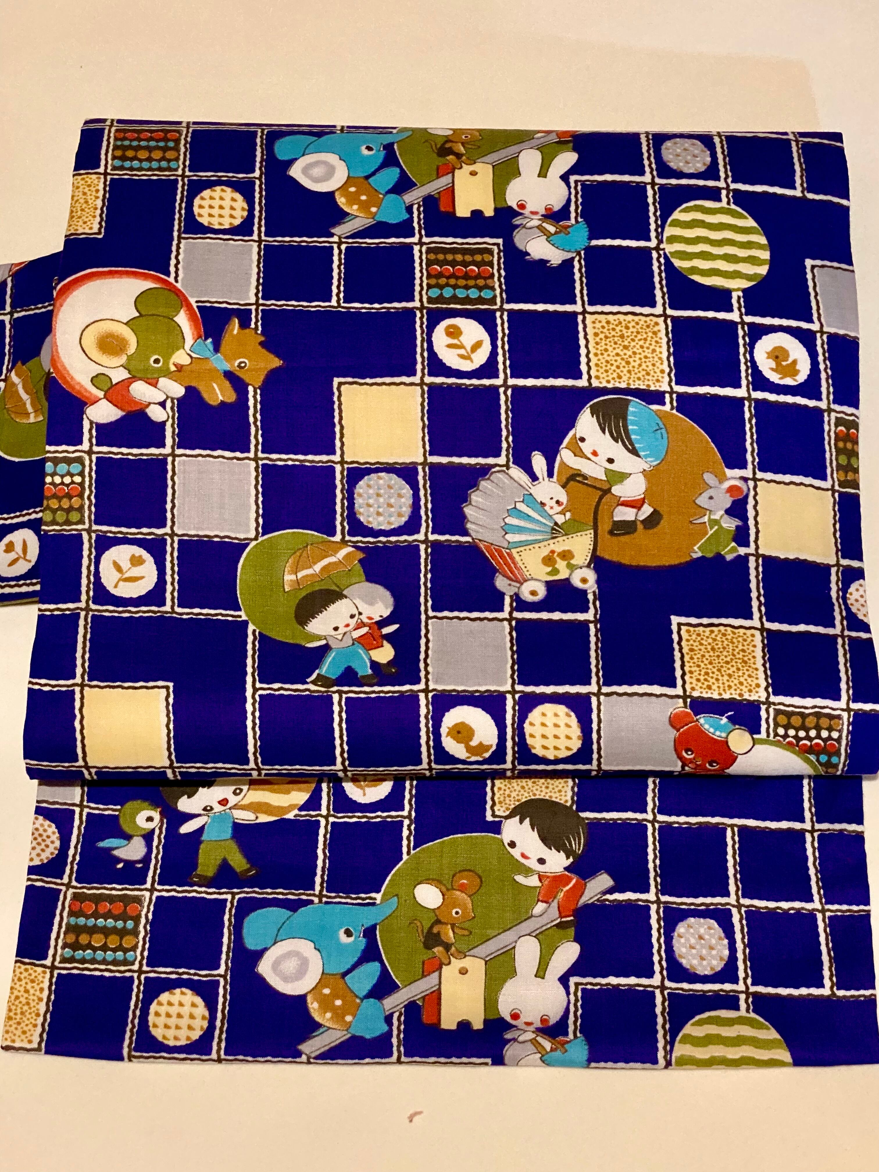 積み木のような動物たちが並ぶ両面名古屋帯です。お太鼓はアンティークの動物たちのハギレタレは更紗風のハギレです♫ タレにも小さなゾウが隠れています。