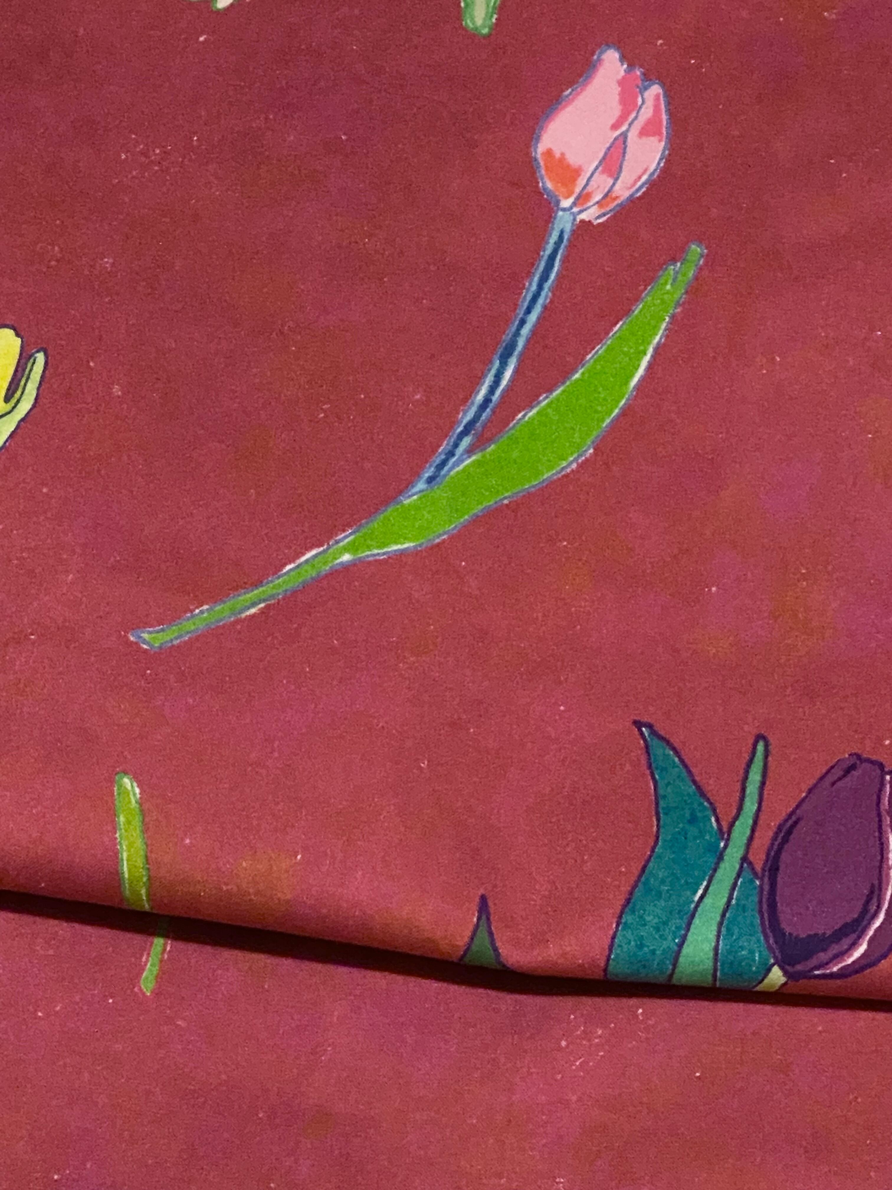 手書き風のチューリップデザインが特徴のリバーシブル名古屋帯です! 裏面は、ハイヒールとバッグのアフリカンバティックです。