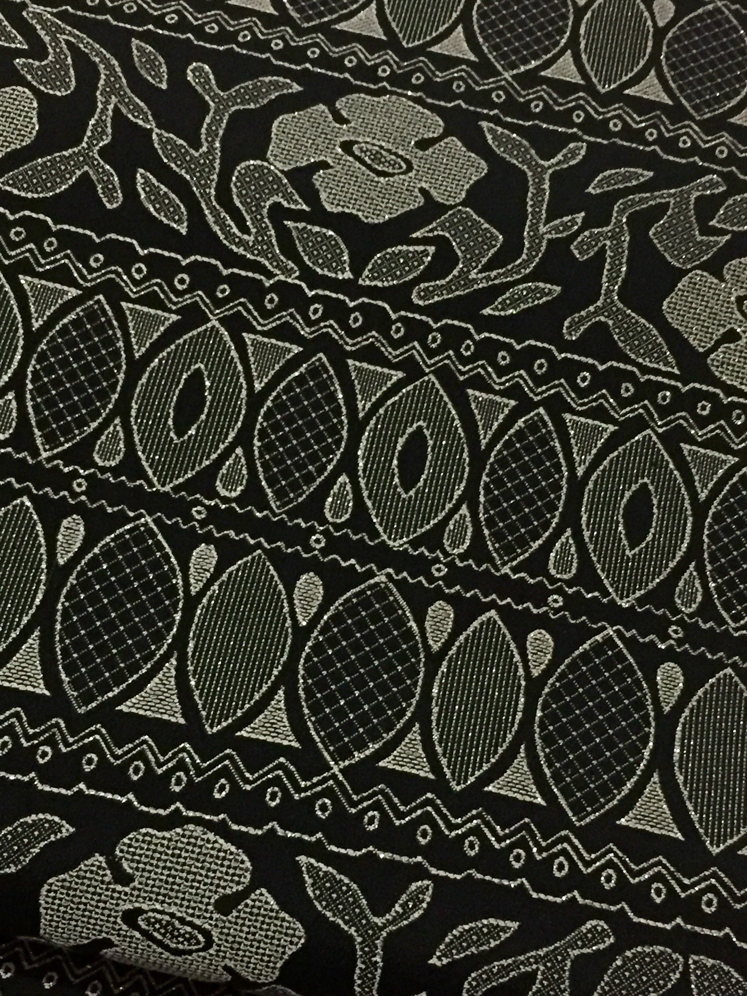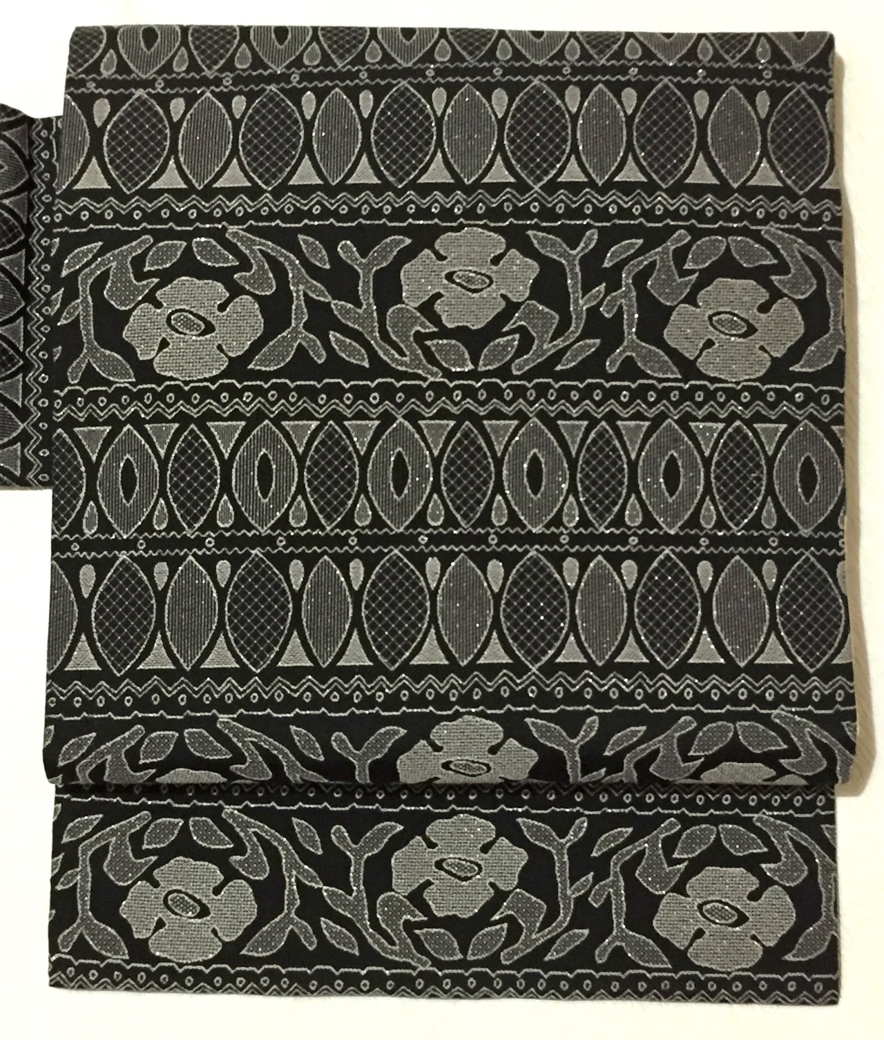 黒地に銀通しのモダンな横段模様と、白地に黒薔薇のハギレで名古屋帯を作りました♫