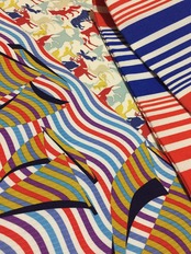 波のようなカラフルなボーダーに、ヨットとカモメが浮かびます! 生地の斜めの縞模様の地紋が立体感をだしています。