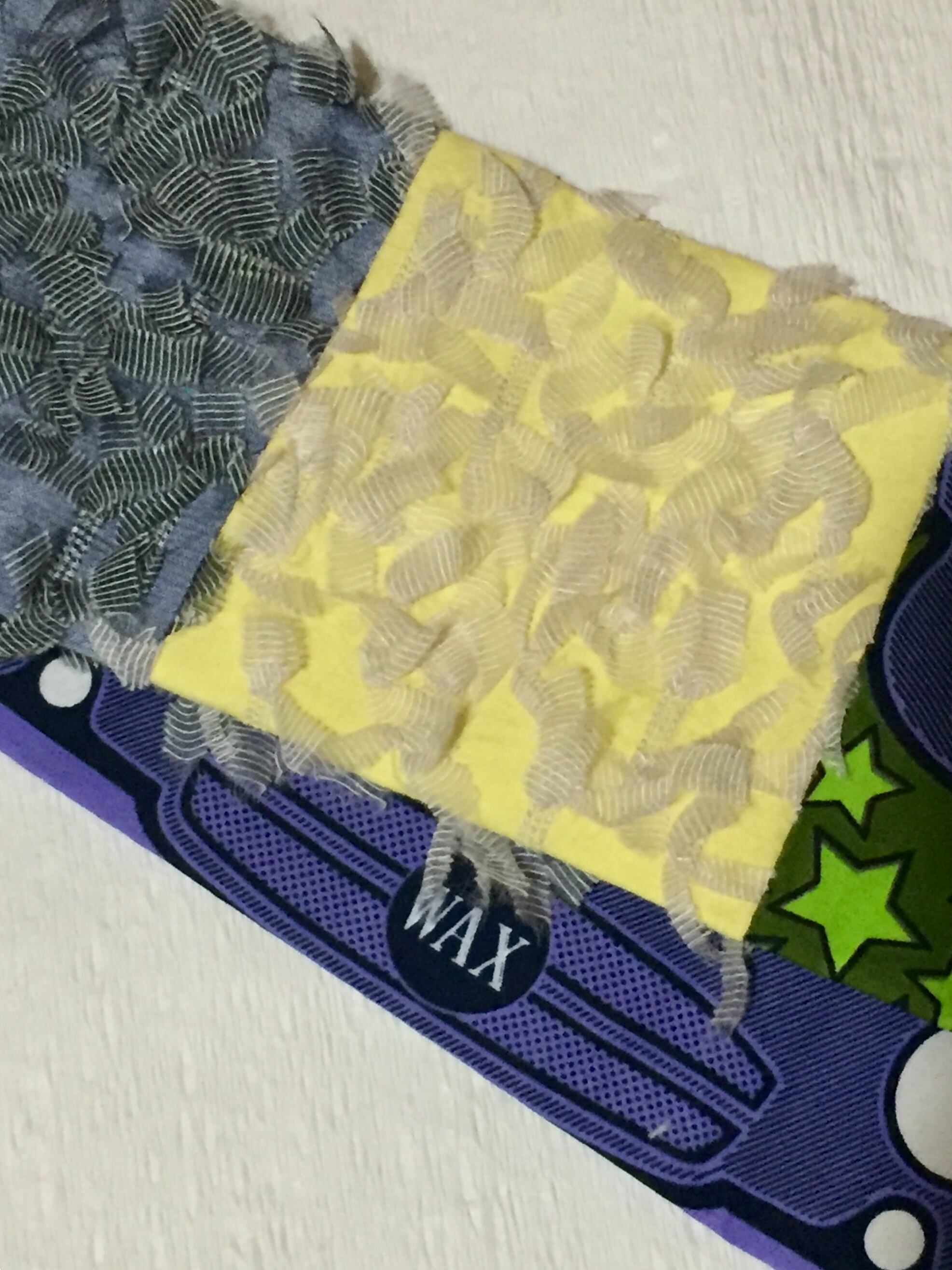 ふわふわのリボンの布2色とアフリカンバティックの自動車模様の名古屋帯!
