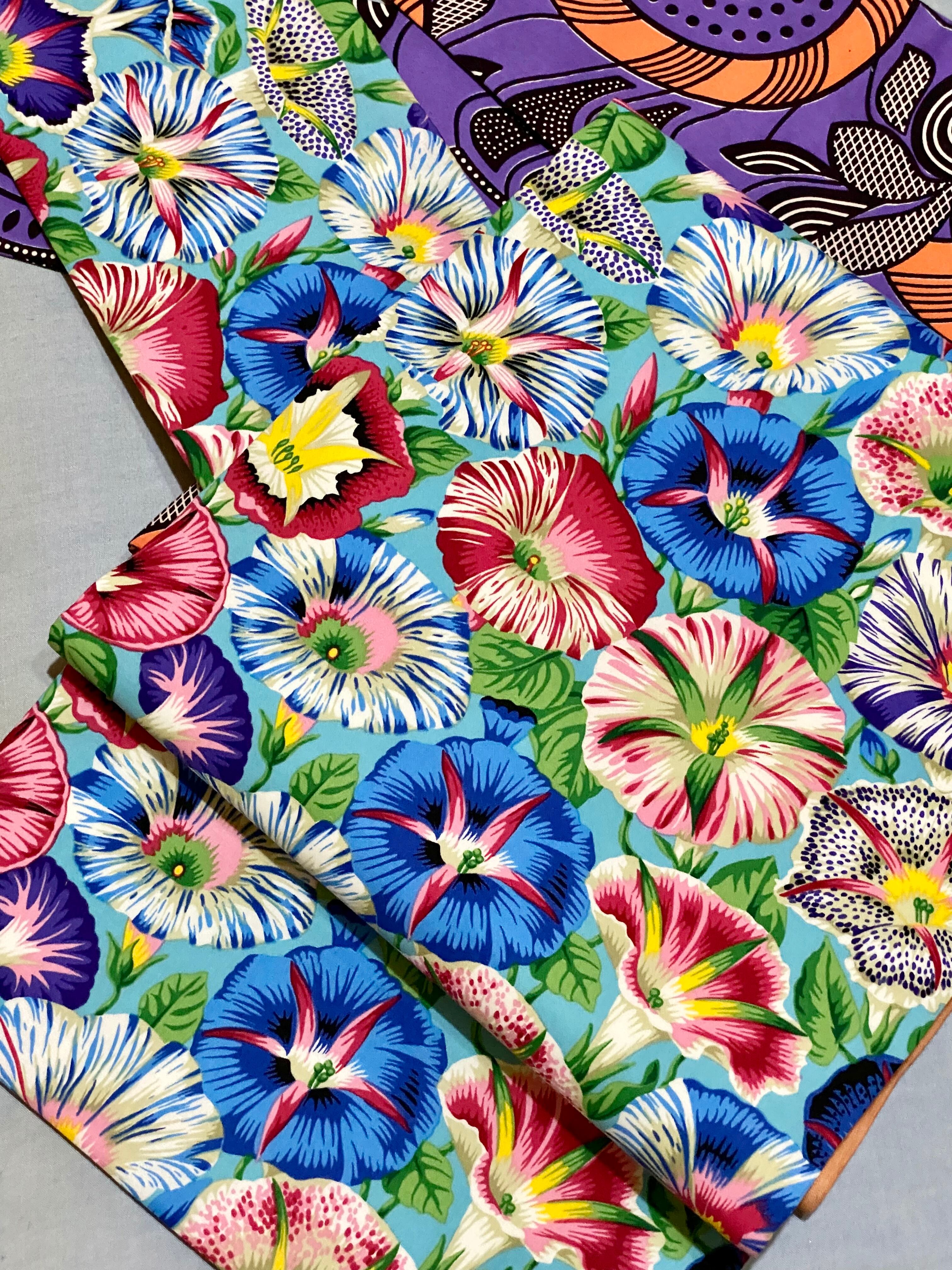 グラデーションが美しいROBE JAPONICAさんの麻の鯉と、華やかな木綿の朝顔、幾何学模様のアフリカンバティックを組み合わせました♫