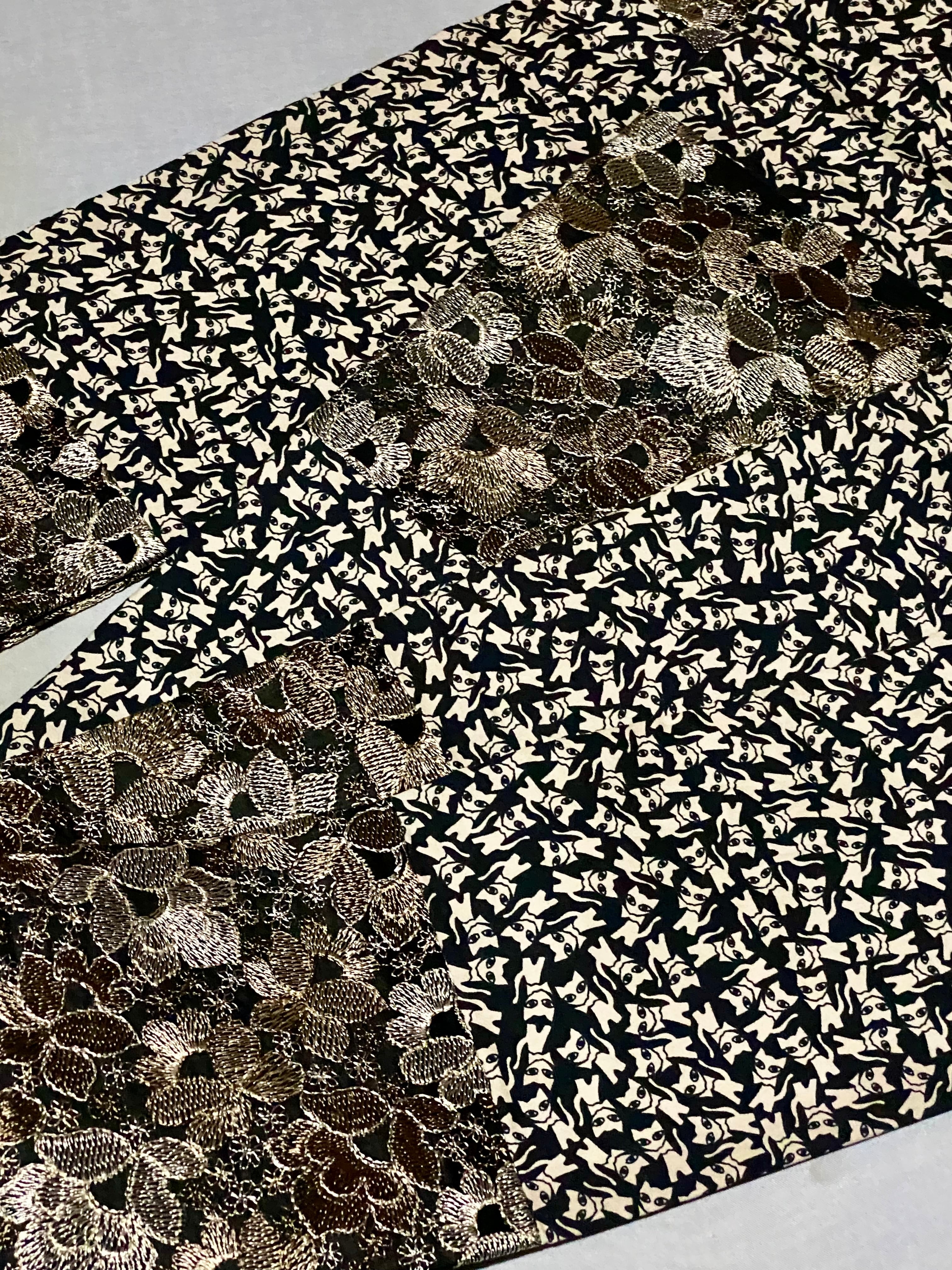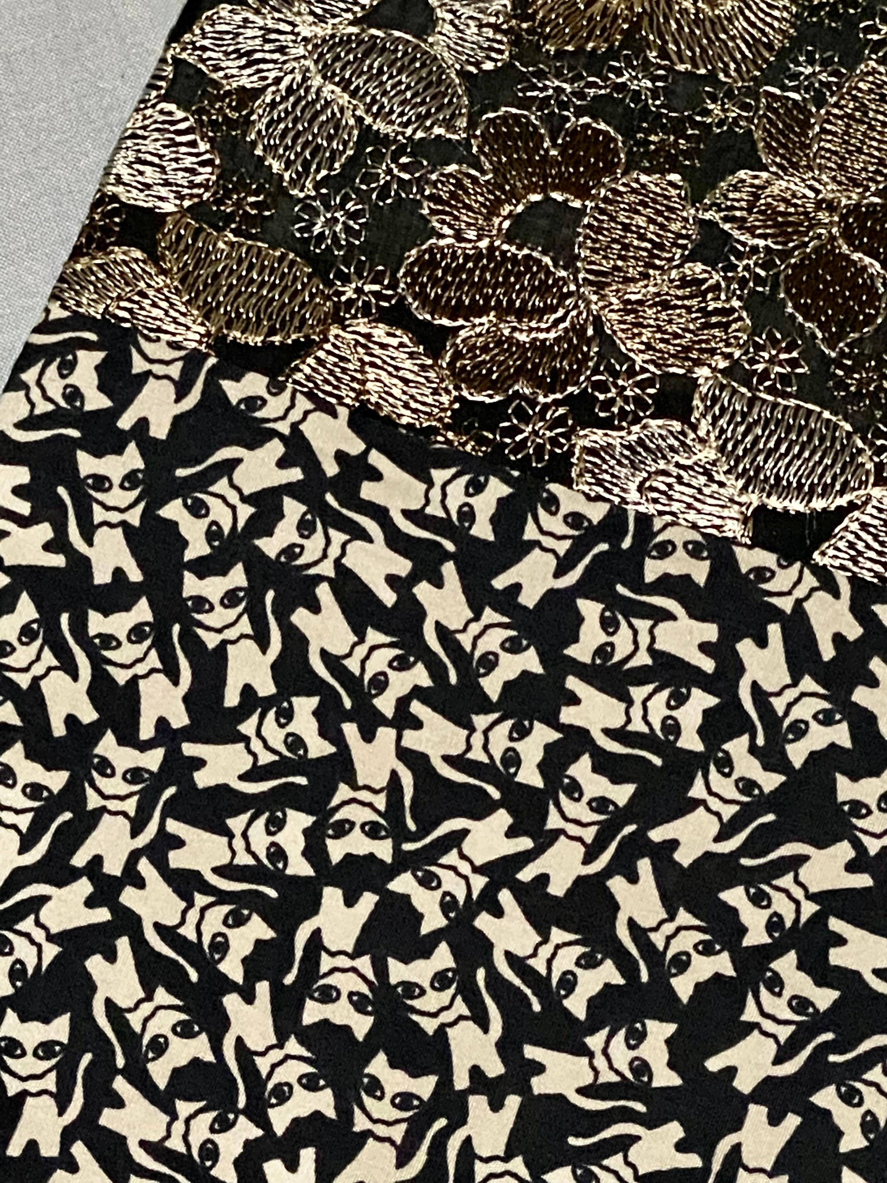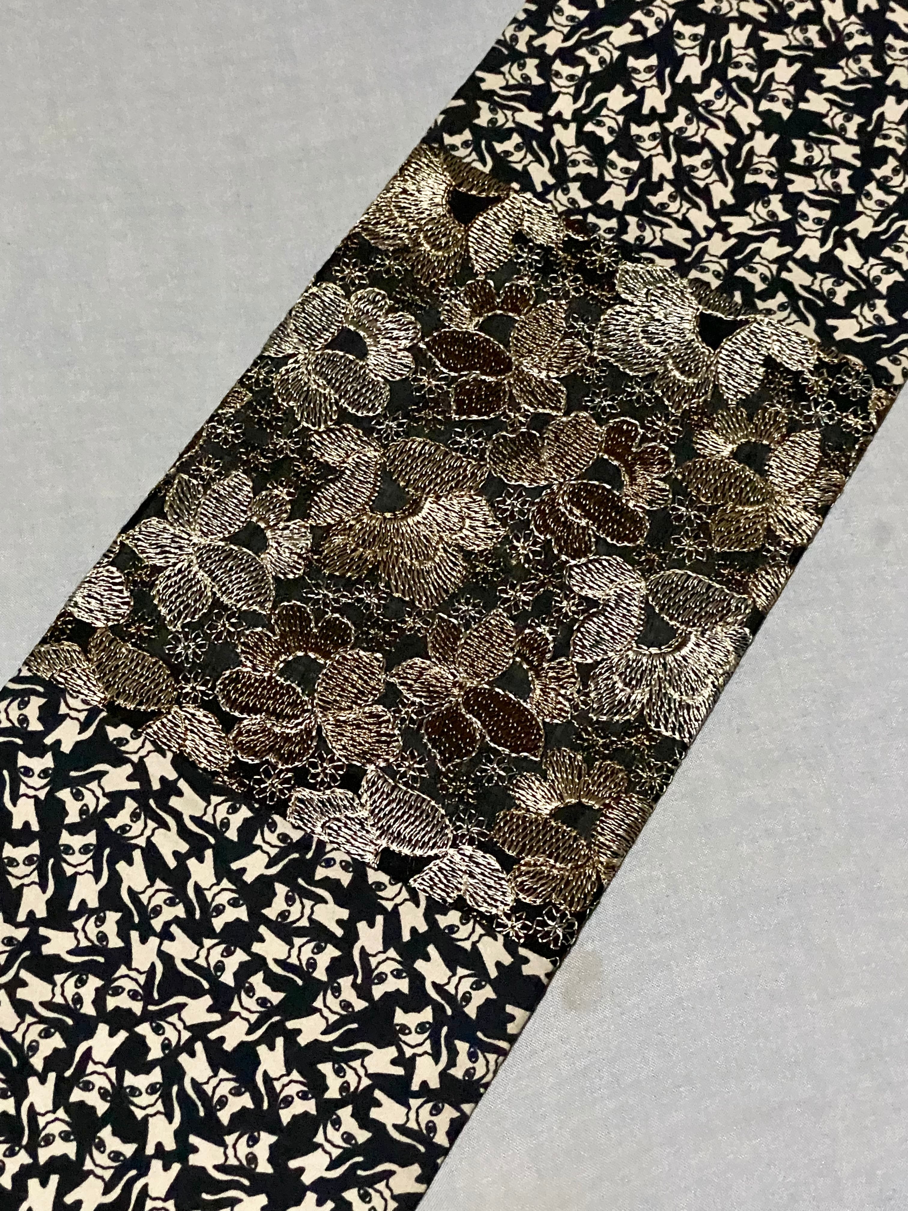 蝶ネクタイをしたキュートな小さな黒猫模様の木綿とレースをつないで作った半幅帯です。