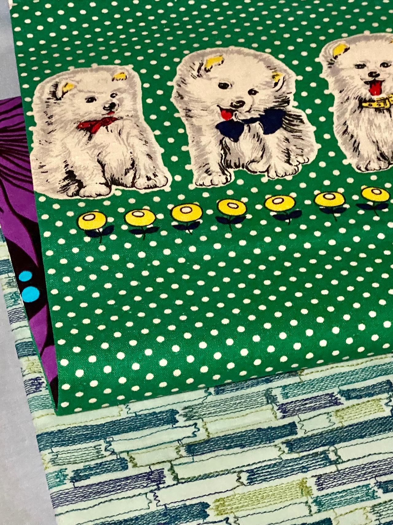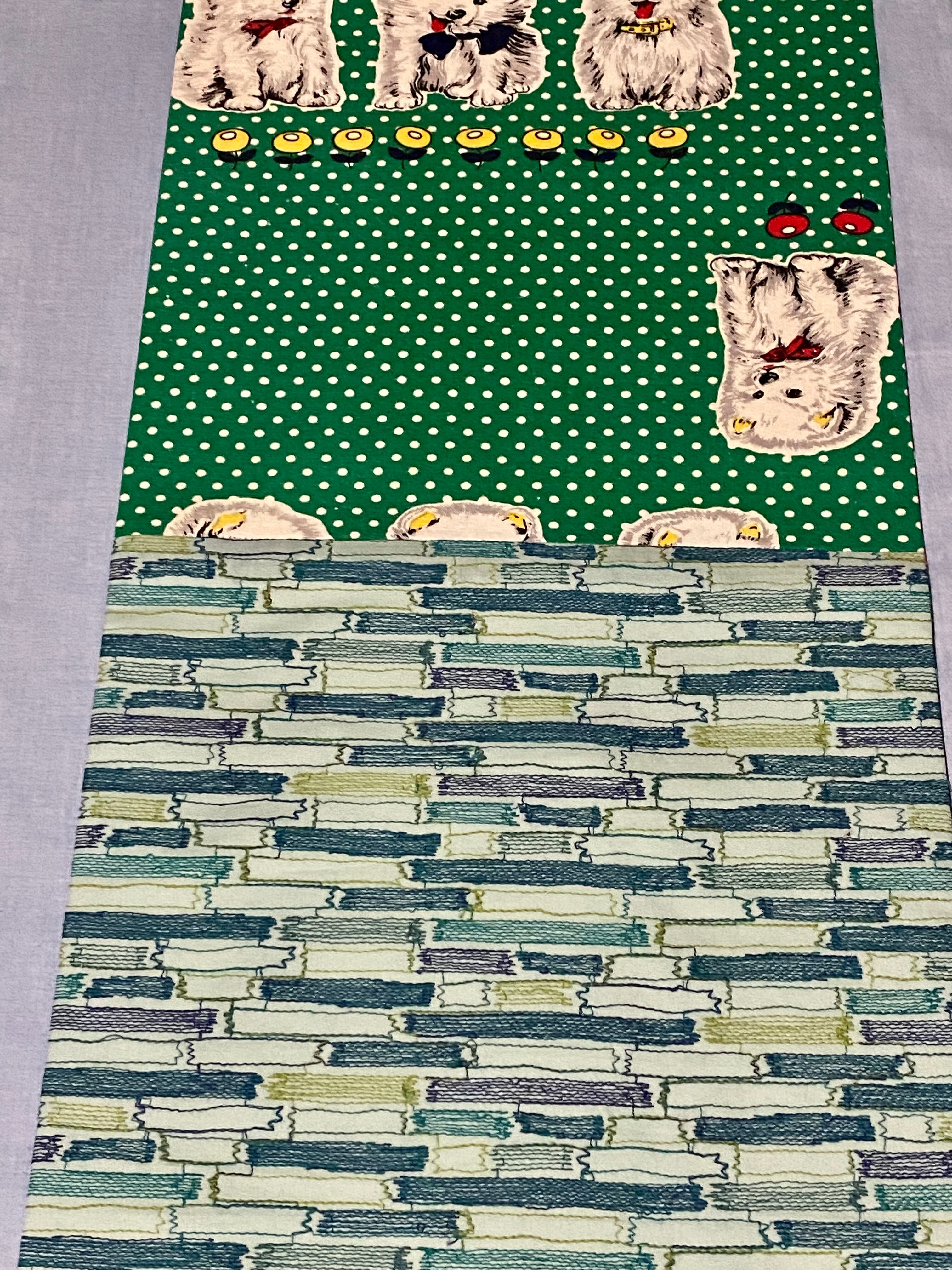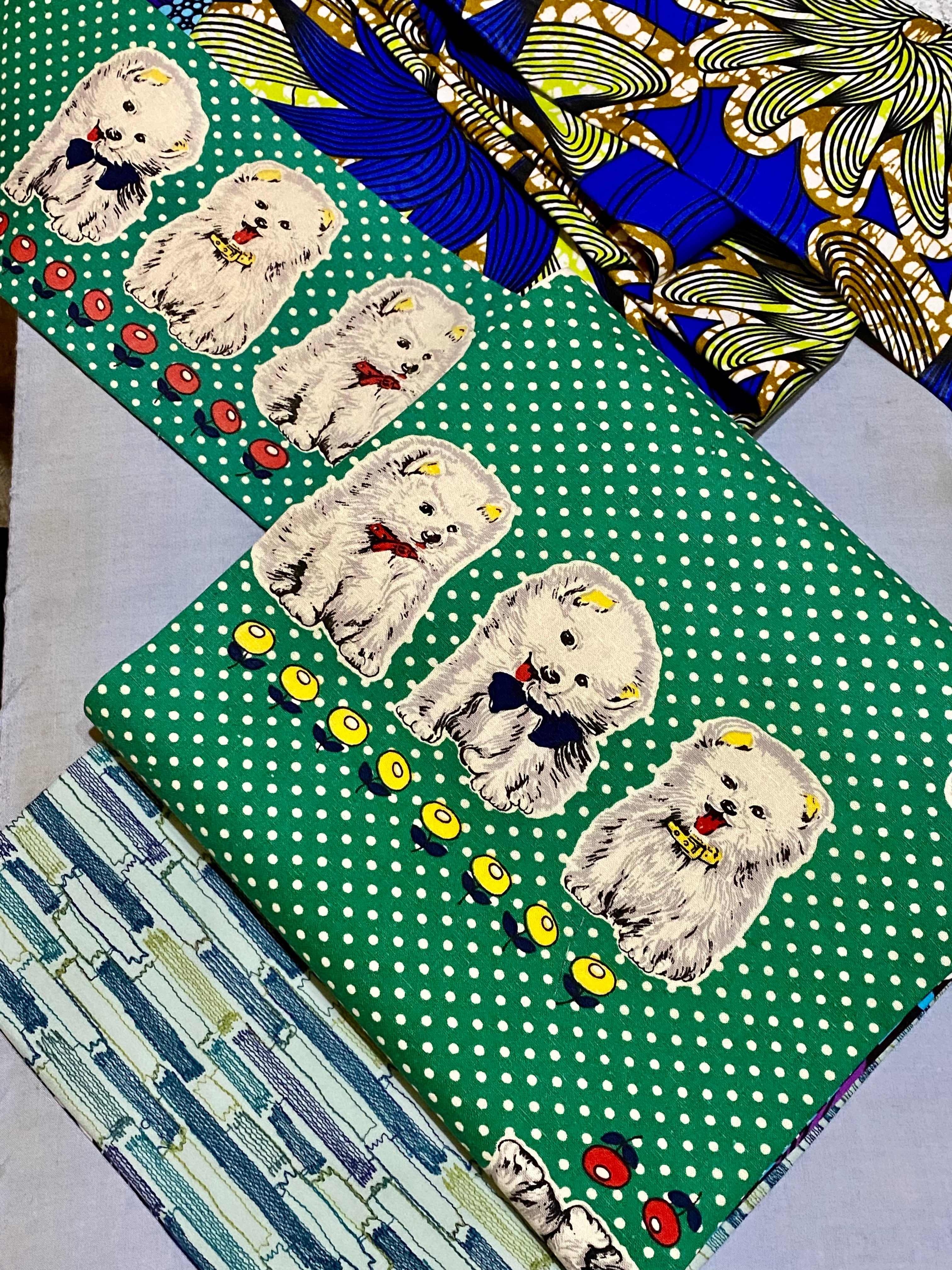 昭和レトロな水玉と愛らしい犬、タレにはレンガ模様のような刺繍のファブリックをあわせました。お太鼓裏は、大きな花のアフリカンバティック2種類の組み合わせ♫