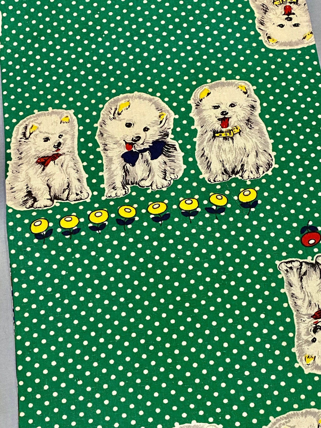 前帯は水玉と犬、上下ひっくり返すとタレと同じ花柄が出ます。
