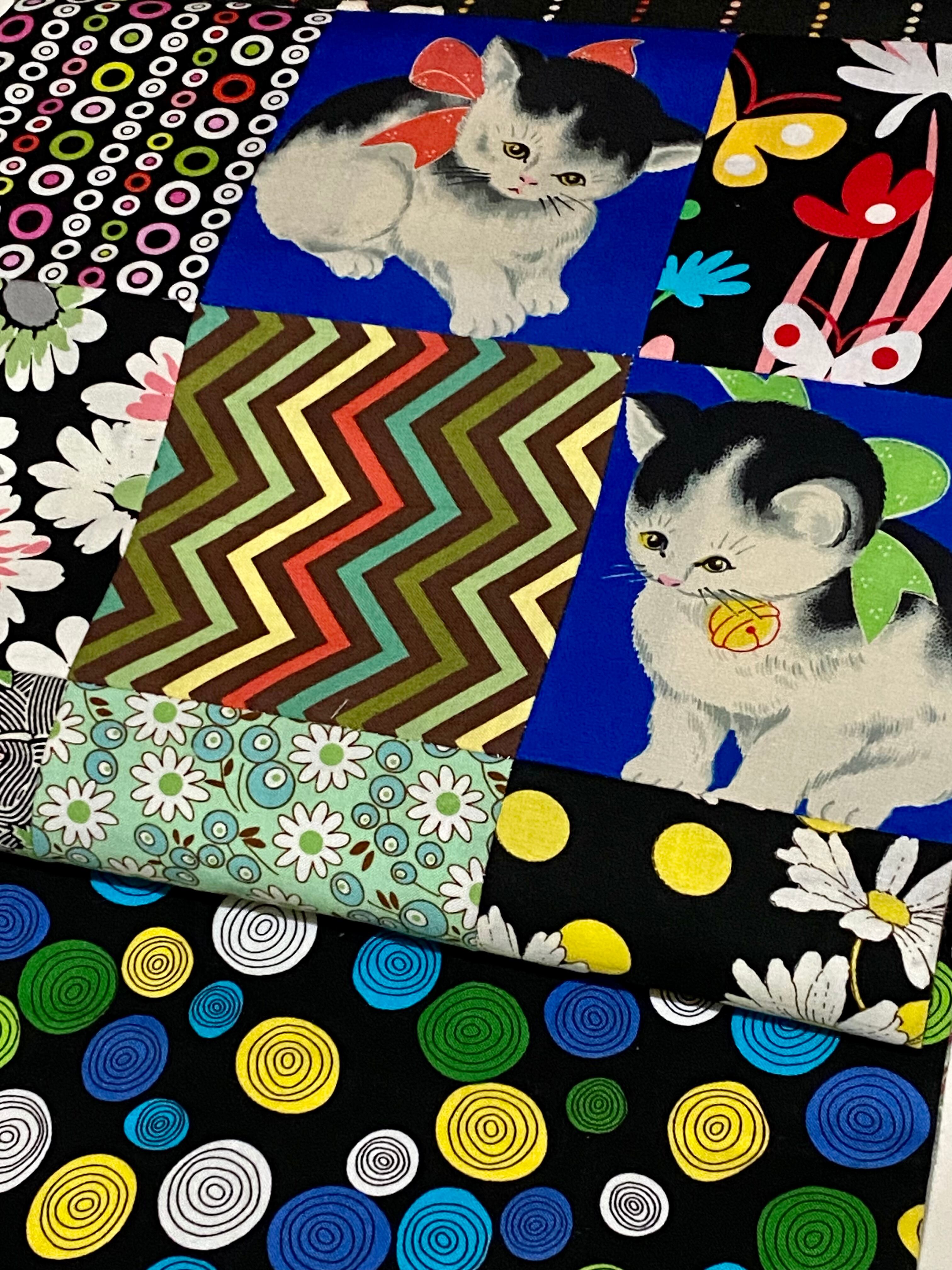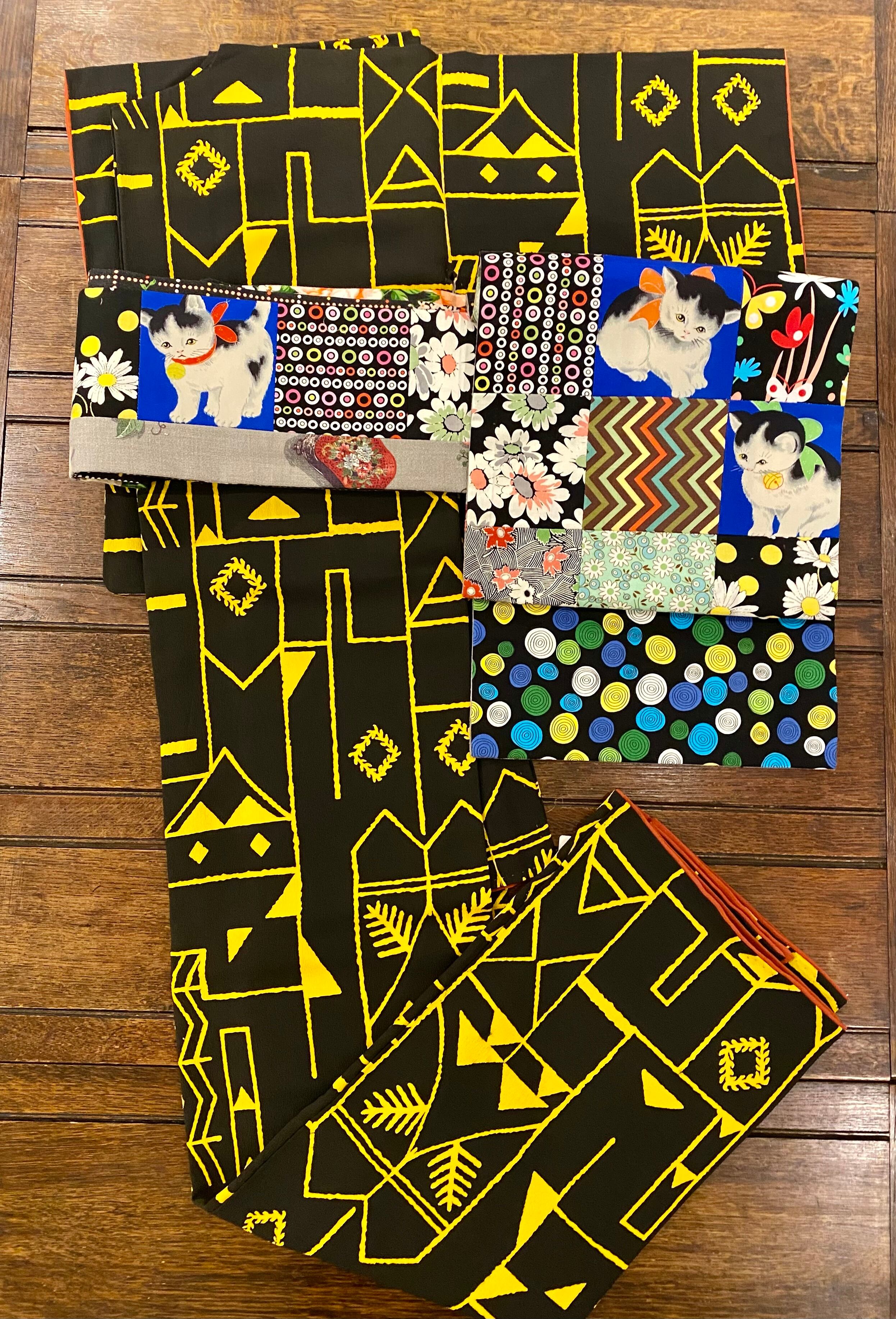 アンティークの子猫のハギレとカラフルな木綿のハギレをパッチワークした名古屋帯、裏はヨーロッパのヴィンテージの木綿、キュートな静物模様です。前帯一巻き目は黒地に花模様でレトロな雰囲気です♫