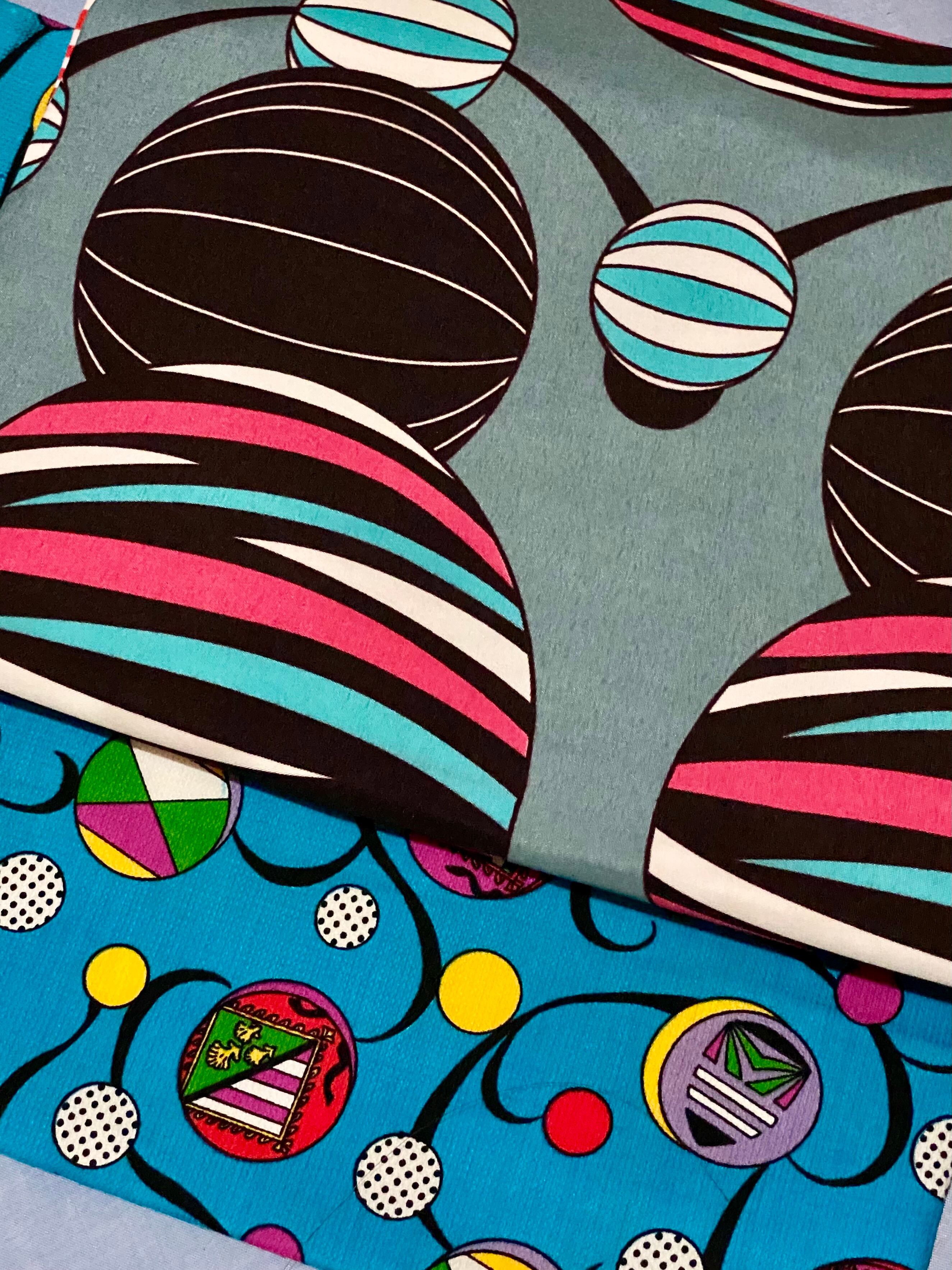 市松模様の球体をベースに配置したモダンな雰囲気に合わせて、風船のようなグレーベースのアフリカンバティックとヴィンテージのコバルトブルーの生地をセレクト、一巻き目にはパステルカラーの幾何学模様をアクセントに!