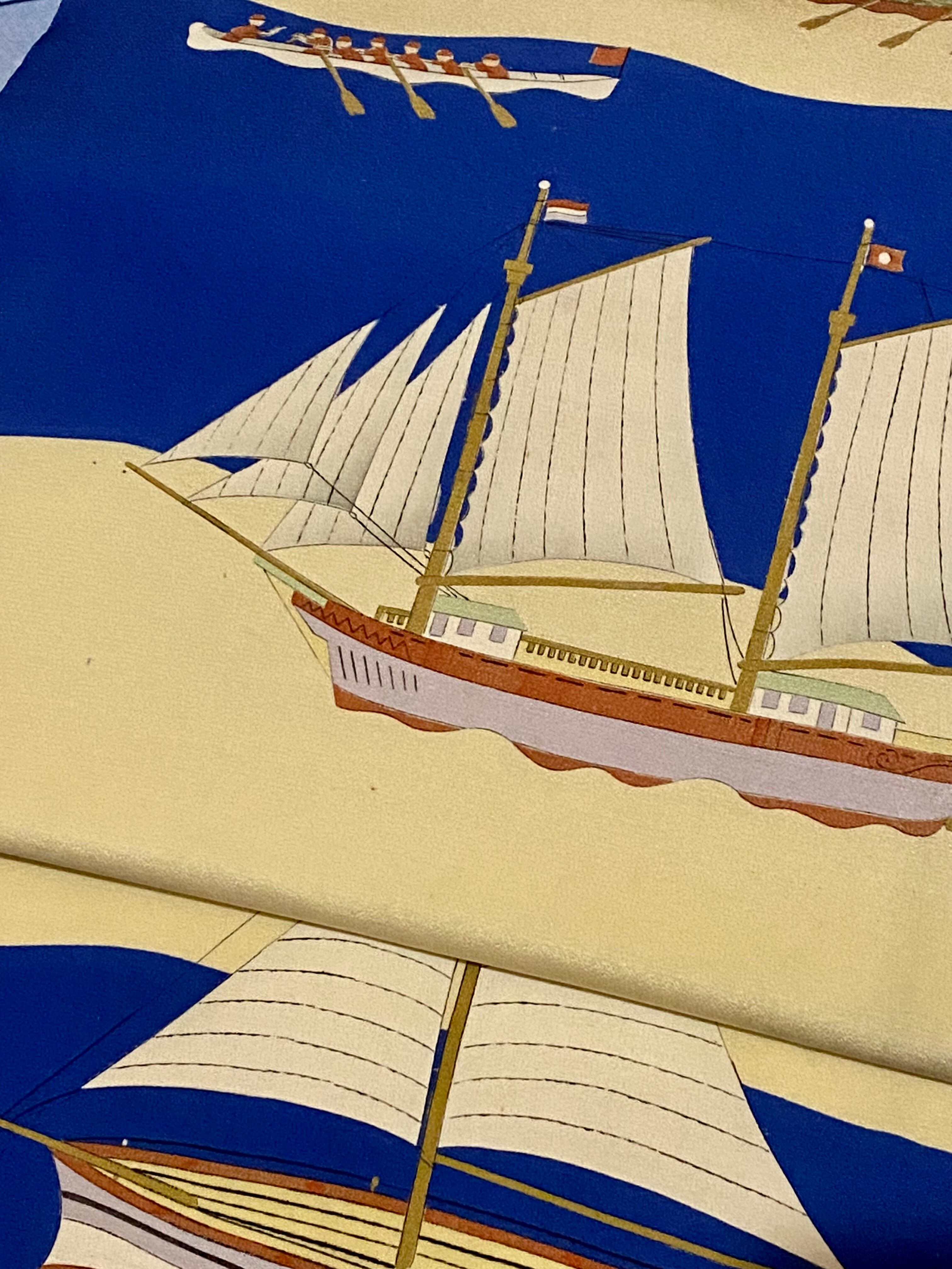 大きな船、ヨット、ボート、いろいろな船が描かれたアンティーク生地の名古屋帯です